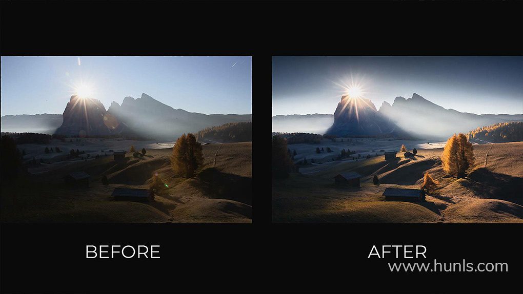 我在一个非常晴朗的秋日在多洛米蒂山脉拍摄了这张照片。当我到达那里时,一开始场景有点平坦,所以我不得不等待太阳从山峰上升起,以便光线开始塑造景观。一旦发生这种情况,场景就开始运行良好,但是仍然有很多工作要做,正如您从下面的之前/之后看到的那样。
