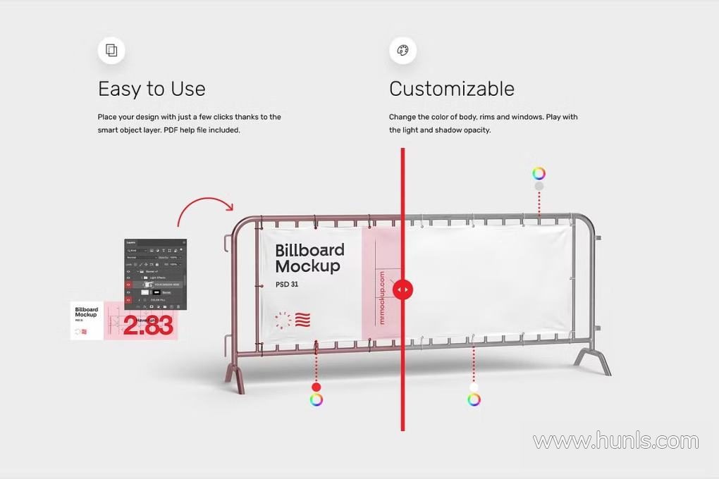 使用我们的广告牌模型让您的广告牌设计演示更具吸引力!所有 PSD 模型均为超高分辨率 7200×4800、300dpi。借助智能对象层,只需点击几下即可放置您的设计。包含 PDF 帮助文件。更改金属元件、螺钉和绳索的颜色。调整光线和阴影的不透明度。您可以添加自己的背景或从 4 种工作室风格和 7 种户外图像中进行选择。只需将设计替换到智能对象层中,点击保存即可完成。非常适合印刷和网页设计。你一定会喜欢它!