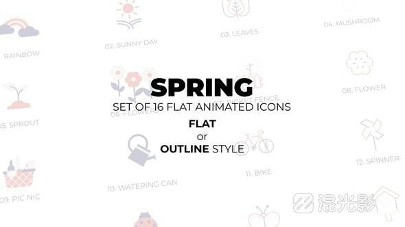 春天16个图标动画鸟屋蝴蝶花卉瓢虫树叶蘑菇栅栏彩虹-AE模板下载 Spring - Set of 16 Animated Icons Flat or Outline style