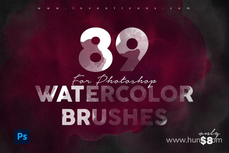 89个数字水彩画Photoshop笔刷打包用于产品广告海报T恤设计 89 Watercolour photoshop Brushes