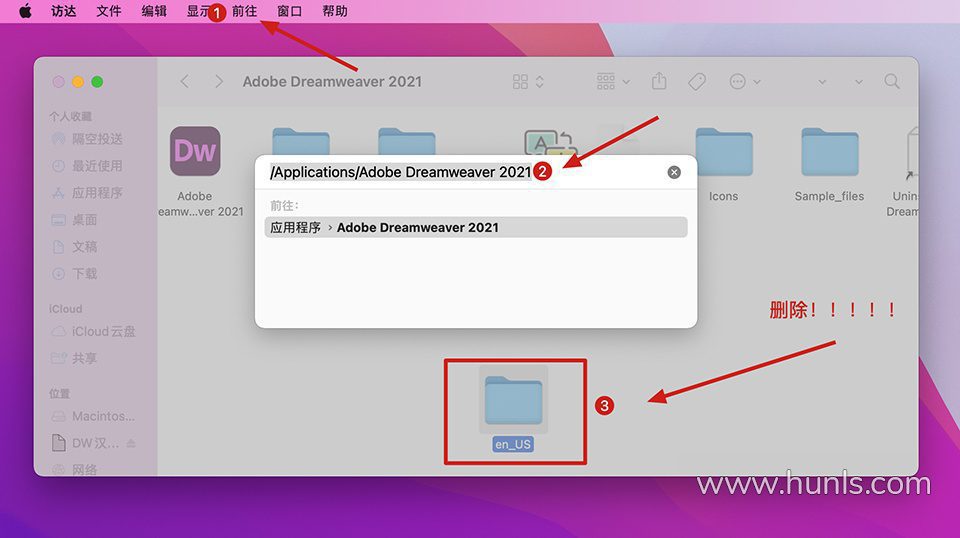 6.打开finder-点击菜单栏的-前往-前往个人文件夹,输入下方命令回车,删除en_US语言包。完美!