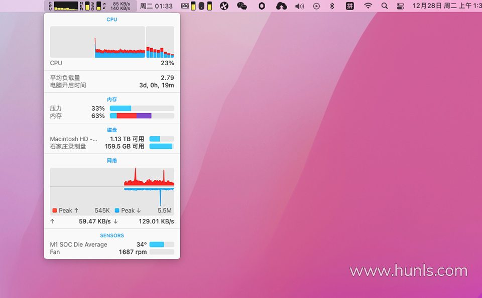 iStat Menus 中文破解版是一款位于macOS状态栏菜单的系统活动监控器,可以帮助您轻松监控系统活动和资源使用情况。您可以及时查看分析您的CPU和GPU,内存,磁盘,网络,传感器,电池或时间,别外还支持在mac的任务栏显示天气,iStat Menus 是用于监控系统状态的不二之选,装机必备,不容错过!