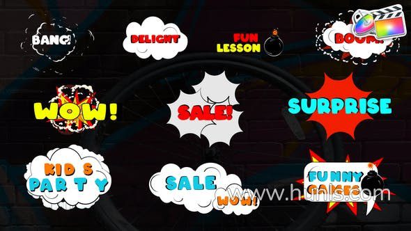 10组漫画卡通动画电视节目综艺视频字幕效果模板FCPX插件 Comic Titles FCPX