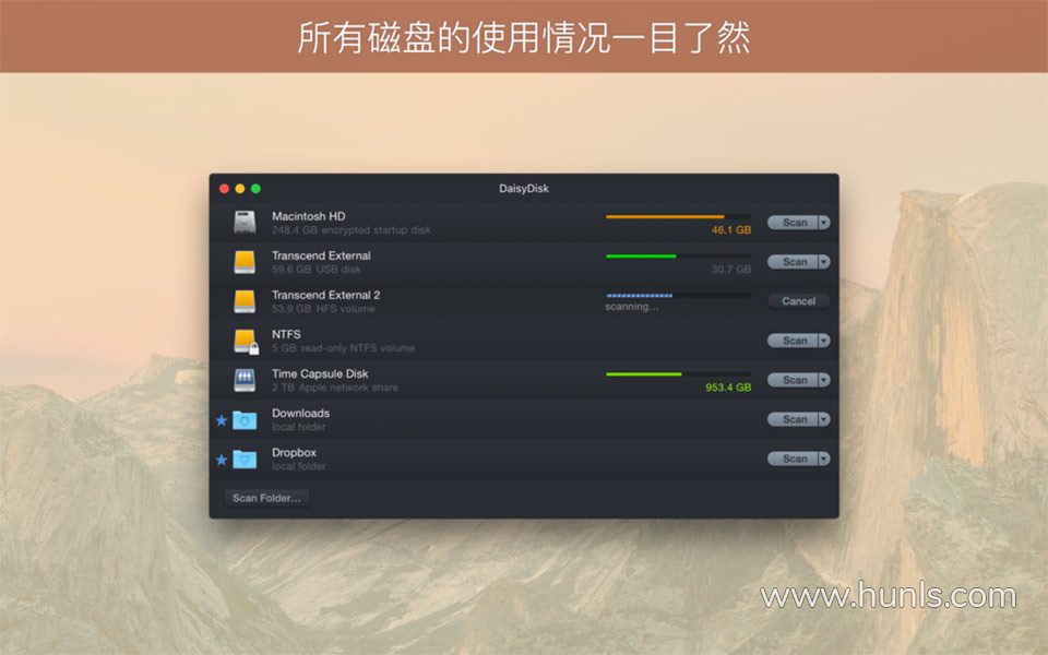 可扫描所有磁盘:DaisyDisk 为您提供了所有连接磁盘的绝佳概览,无论是 Macintosh HD、Thunderbolt 磁盘、闪存、网络存储,应有尽有。所有显示的数据都会实时更新,因此您可以随时判断是否有足够的空间来安装新游戏或下载高清电影。