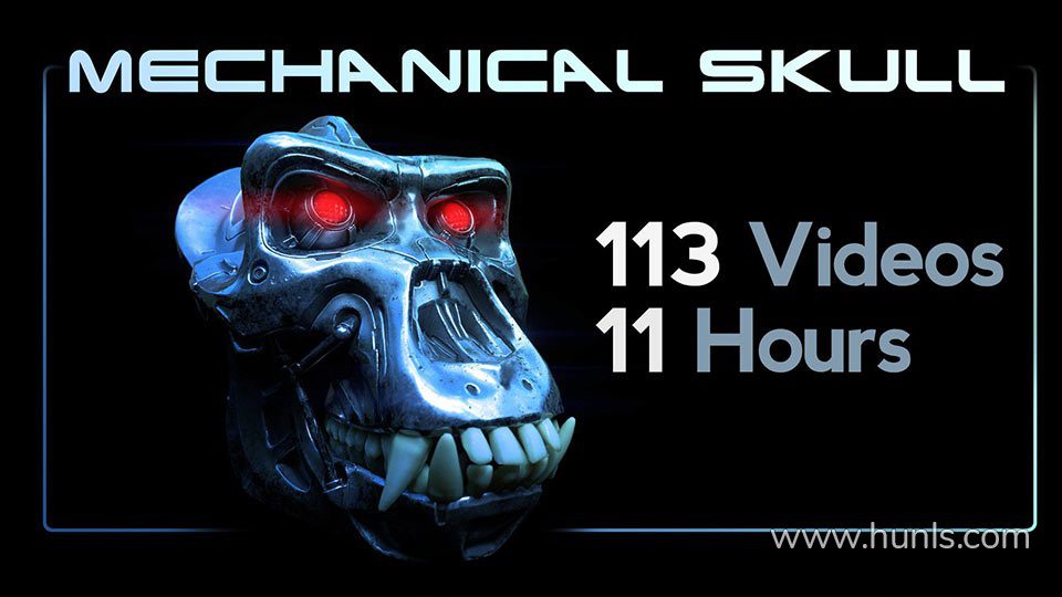本教程是关于机械头骨数字雕刻建模完整制作流程视频教程,时长:13小时,大小:6.7 GB,MP4高清视频格式,教程使用软件:Zbrush,Maya,Substance Painter,Marmoset等,附源文件,作者:Michael Pavlovich,共113个章节,语言:俄语。