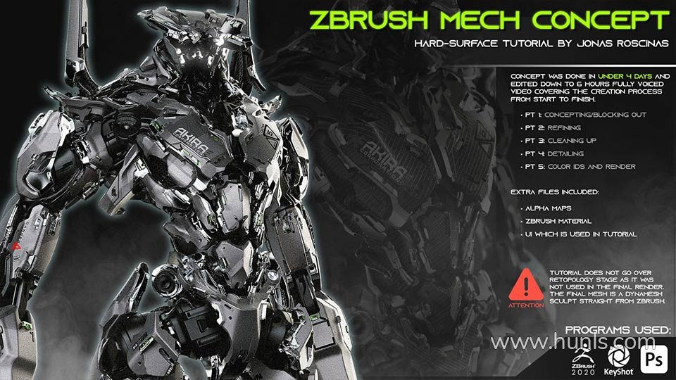 本教程是关于ZBrush机甲机器人概念设计雕刻制作全流程视频教程,时长:6小时,大小:4.1 GB,MP4高清视频格式,教程使用软件:Zbrush, Keyshot,Photoshop,附源文件,作者:Eric Keller,共25个章节,语言:英语。