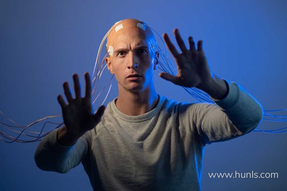 This is a photo shoot of a man with a neurointerface, an image in cyberpunk style, science fiction and futurism.
