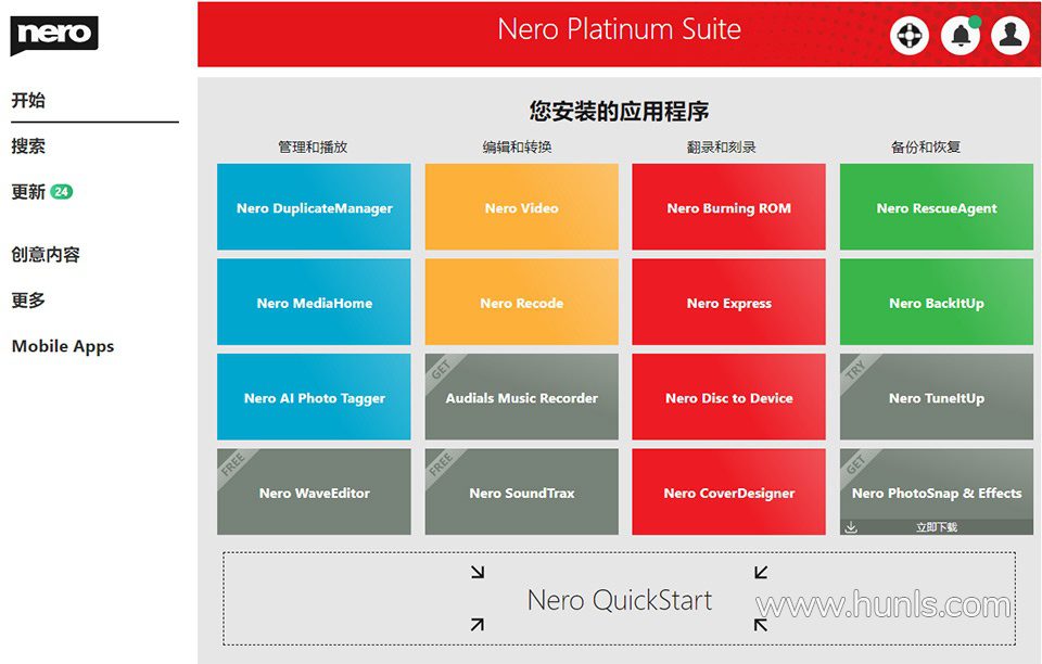 nero 2021全称nero platinum suite 2021,这是一款专为Windows系统电脑提供的包含七种功能强大且匹配良好程序的多媒体套件,通过它不仅可以帮助用户解决照片、备份、视频、多媒体管理、烧录等各种多媒体方面的使用需求,而且还可以制作、编辑、翻录、转换、刻录、复制、存档、下载、保存、加密、压缩、流传输等200多个超级专业实用的功能,运行更快、稳定,非常可靠,是一套备受欢迎的全方位多媒体解决方案。另外,nero platinum suite 2021中提供给用户的主要软件是Nero DuplicateManagerPhoto、NeroBackItUp、NeroVideo、NeroMediaHome等软件,而且为了方便用户使用,每一个程序都有自己的独立窗口,并且每个窗口都非常简洁,只需根据文字提示就快速上手进行使用。