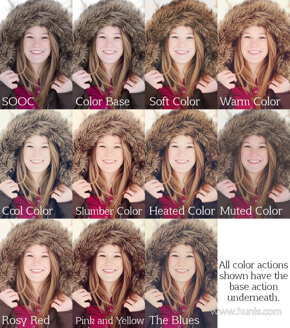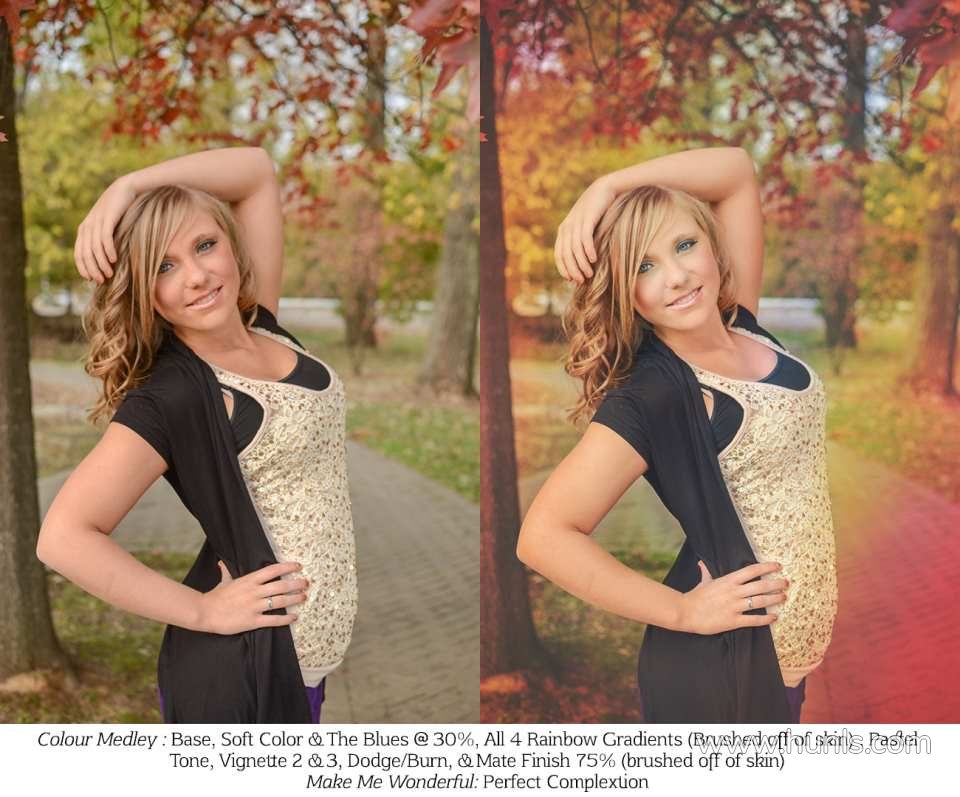 Colour Medley contains over 80 actions including a base color action (contains sharpening layer and quick exposure adjustment layers), 9 color actions, base BW action (contains sharpening layer and quick exposure adjustment layers), 5 BW actions, 1 BW Toning action, Plus Mix, Match, and Layer: 23 light leak actions, 19 Gradient actions, 21 Hazes and Tones, 9 Finishing actions (vignettes, matte finish, dodge/burn, flatten, and resize for web). Inspired by the natural light leaks in film and the colorful editing styles. This set is the ultimate set for the creative photographer. Take your images to a new level with this set of actions.