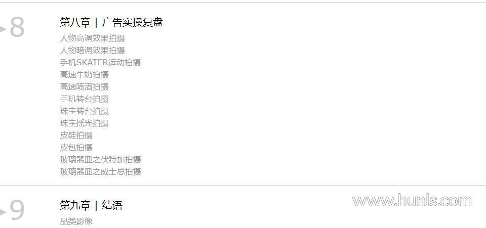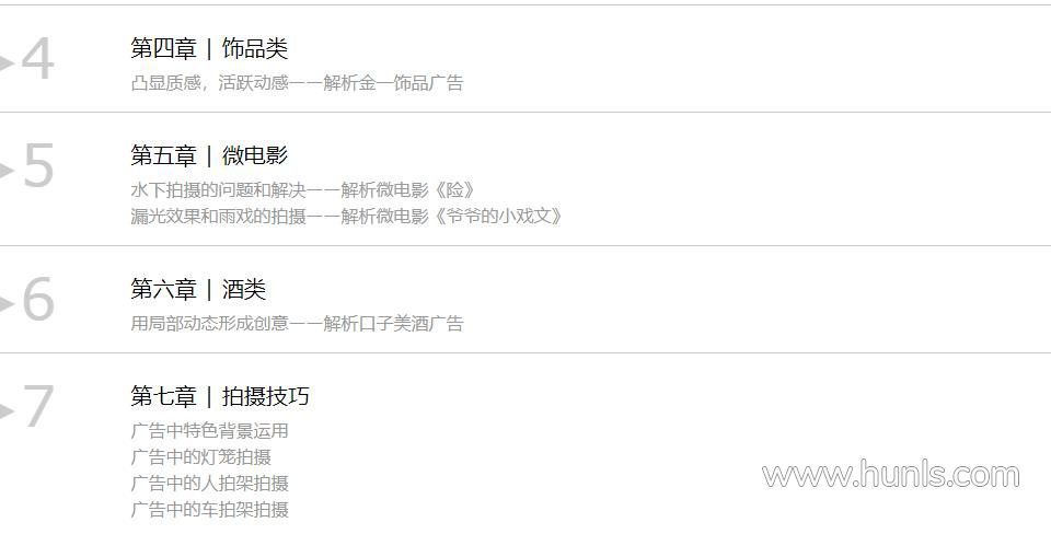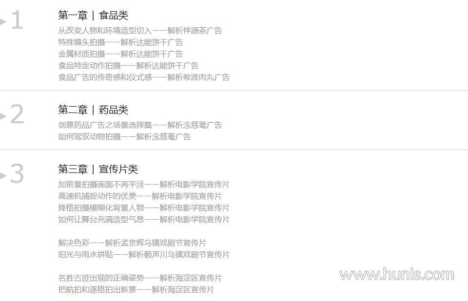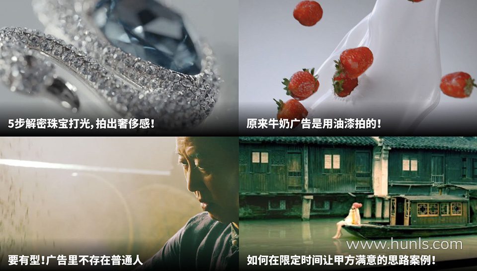 课程内容含 32 支广告案例解析,12支广告实操复盘, 品类涉及汽车、数码、食品、医药、酒类、珠宝、箱包等,以及城市宣传片、微电影。课程剖析多样特种拍摄技法,如高速摄影、逐格拍摄、人拍架、车拍架等,以及不同产品打光艺术。