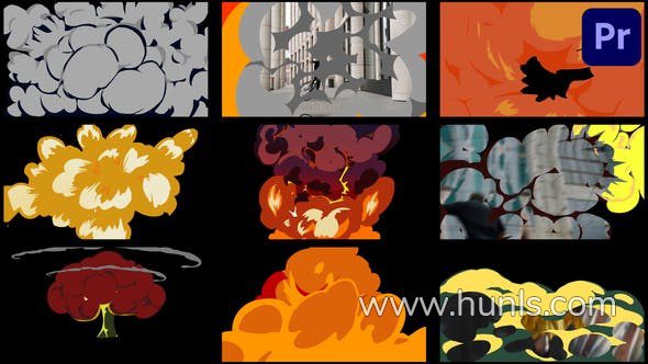 PR模板 - 火焰爆炸能量粒子烟雾弥漫炫酷卡通特效 Cartoon Explosion Transitions Pack Premiere Pro MOGRT