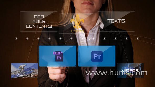 面向企业和公司的现代促销介绍广告!一个模块化的高科技触摸屏 HUD 环境,由一位女性白领企业家选择的数字显示器!适合许多公司企业(设计公司、教育/科学学院、广告和营销公司等)推广产品或服务!