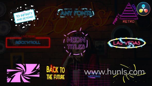 DR达芬奇模板-明亮闪烁霓虹标题集合制作复古迪斯科派对旅游幻灯片工程文件下载