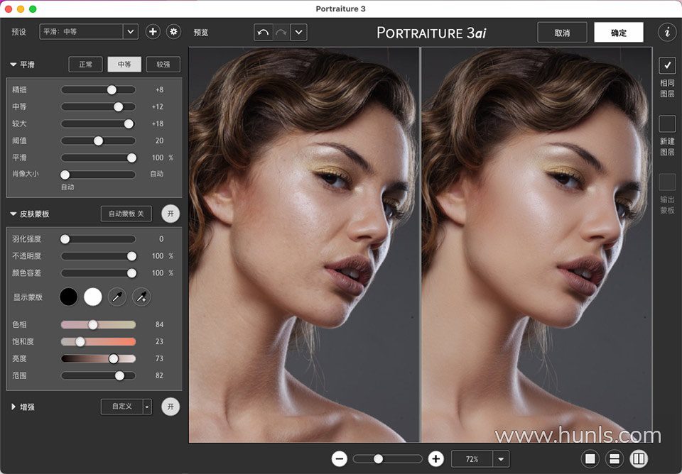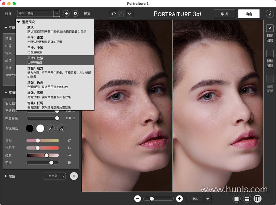 最受欢迎的一款专业磨皮滤镜插件 Imagenomic Portraiture V3.5.4 for mac 终于出汉化中文版了,插件一键安装,一秒磨皮,无卡顿,效果好。用于人像图片润色,减少了人工选择图像区域的重复劳动。它能智能地对图像中的皮肤材质、头发、眉毛、睫毛等部位进行平滑和减少疵点处理。滤镜效果非常不错,处理速度很快速和智能。如果把参数设置好,也可以进行商业级质感磨皮。