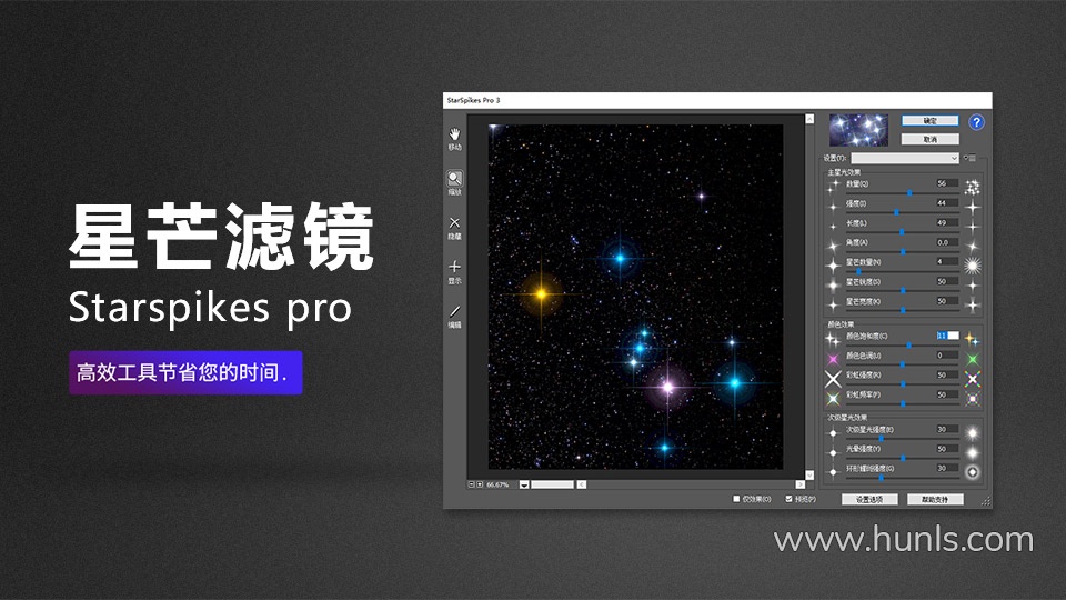 星光滤镜 ProDigital Software Starspikes pro 3.1.2 中文汉化版 只需在PS滤镜菜单下打开,通过调整简单直观的设计参数,即可轻松制作出星芒效果。