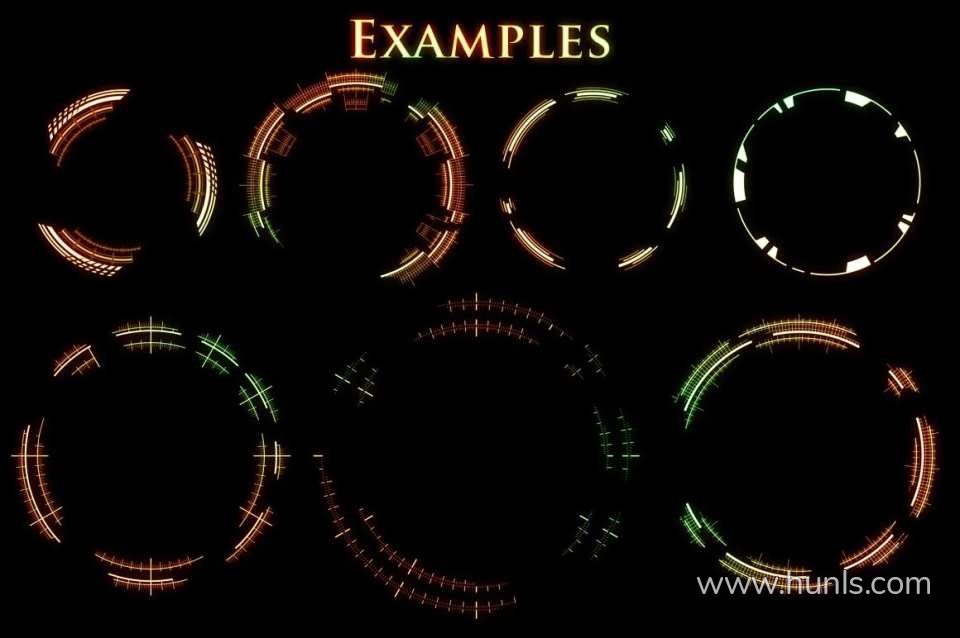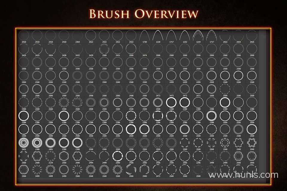 在本产品中,您会发现198 种简单的未来派圆形画笔,格式如下: