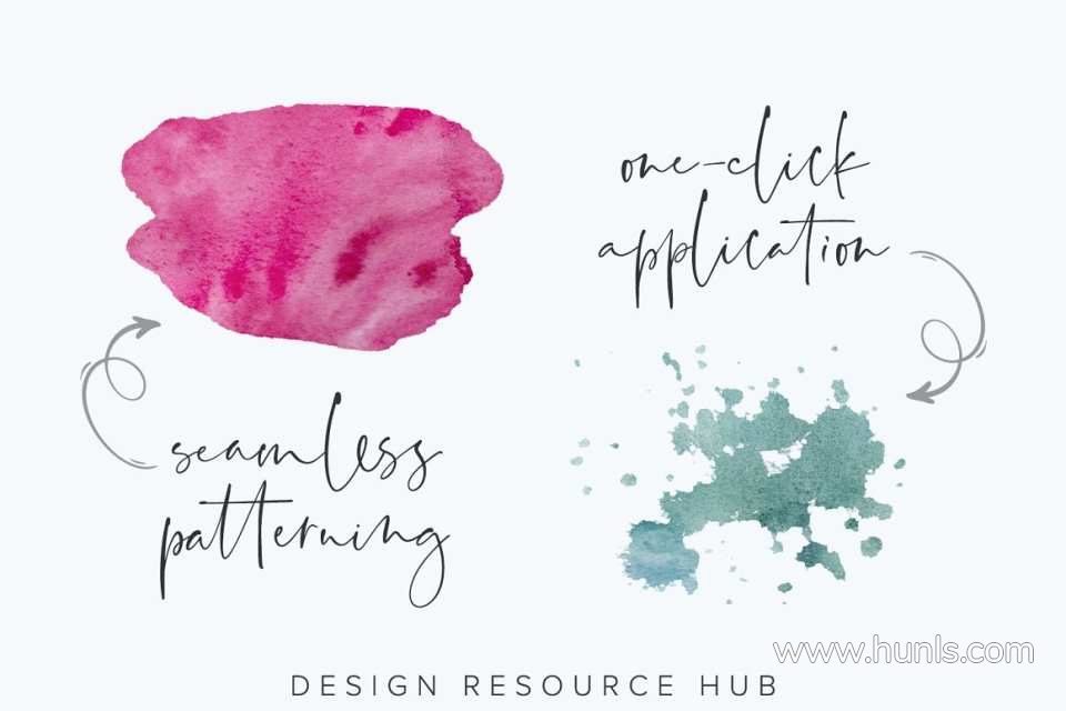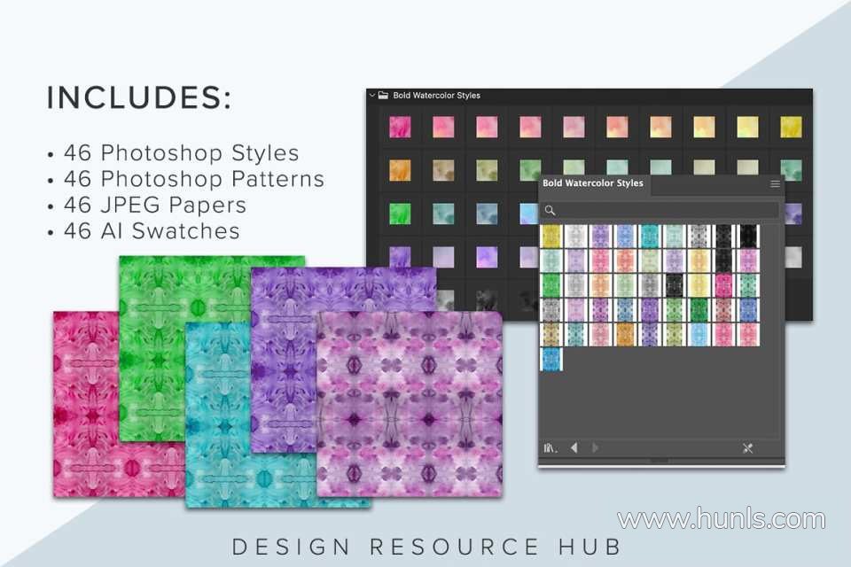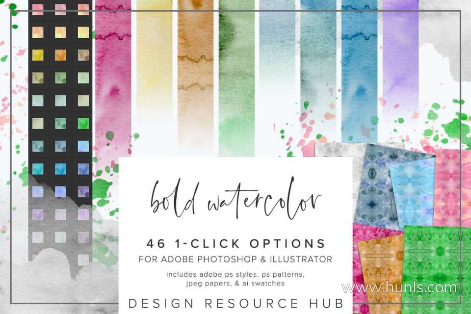 【PS样式】46种水彩画纹理图案文本样式PS样式AI色板 Bold Watercolor PS Styles