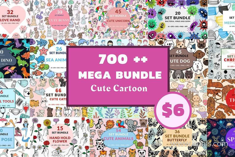 700+儿童卡通可爱花鸟动物卡片涂鸦绘画设计图片素材(含矢量+PNG)Cute Animal Cartoon for Kids Bundle