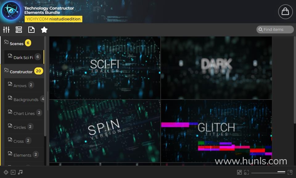 echnology Constructor Elements Bundle技术构造元素束后的影响是一个伟大的工具,创造您的科幻和高科技视频。有6个预先制作的场景和20多个元素,只需点击一下就可以使用。使用预先制作的场景或构建自己的现场预览和自适应分辨率。