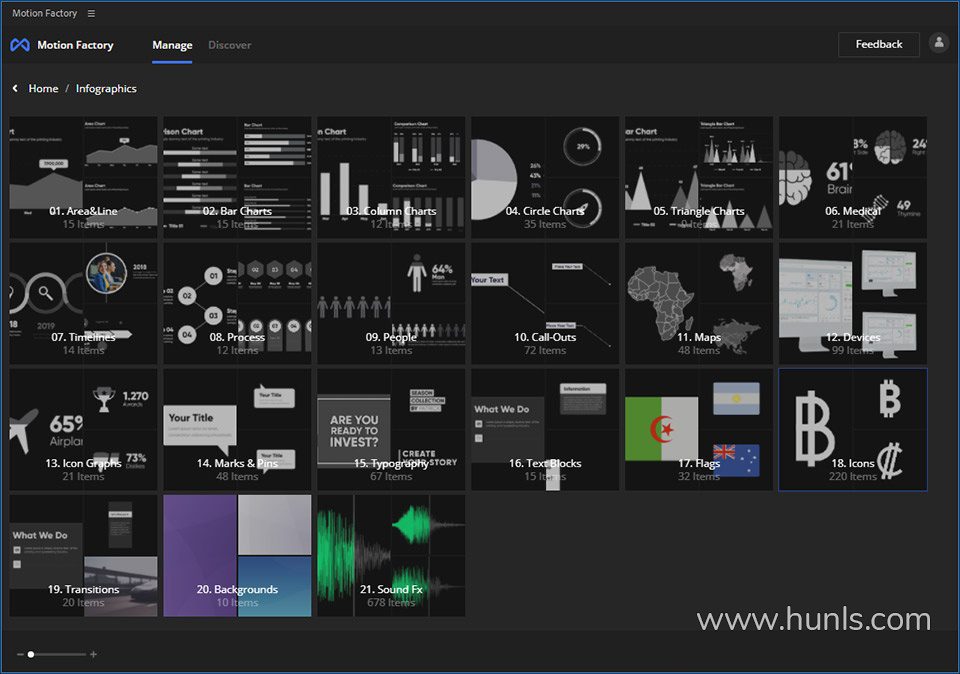 Infographic Elements包含1000多个图表和元素。这是创建视频信息图的最佳方式。与Motion Factory脚本配合使用更加省时,可帮助您获得引人注目的视频。让您的数据更上一层楼!