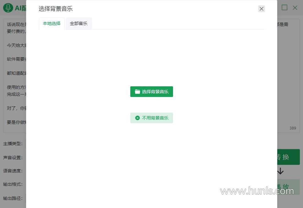 软件需要安装后使用,拥有一个超大的文本输入框,支持对语音类型、背景音乐、音量、语速、输出格式等进行调整。