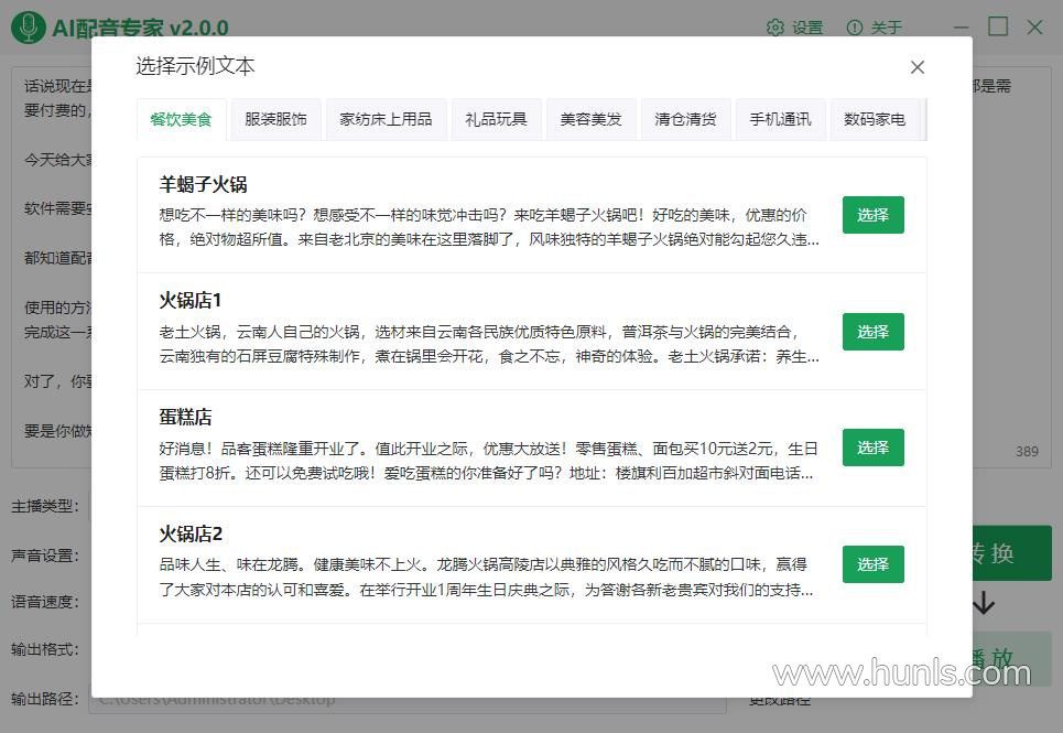 对了,你要是脑里没头绪可点击“示例文本”,里面的文案可直接套用,点击选择,稍微修改就可以转换成自己的配音文件了。