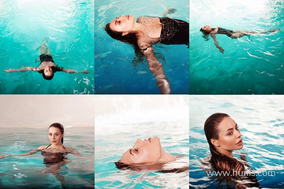 大家好,这个包里有130张照片,是在游泳池里拍的水下照片,有两个模特。其中有一张模特漂浮在水面上的照片。