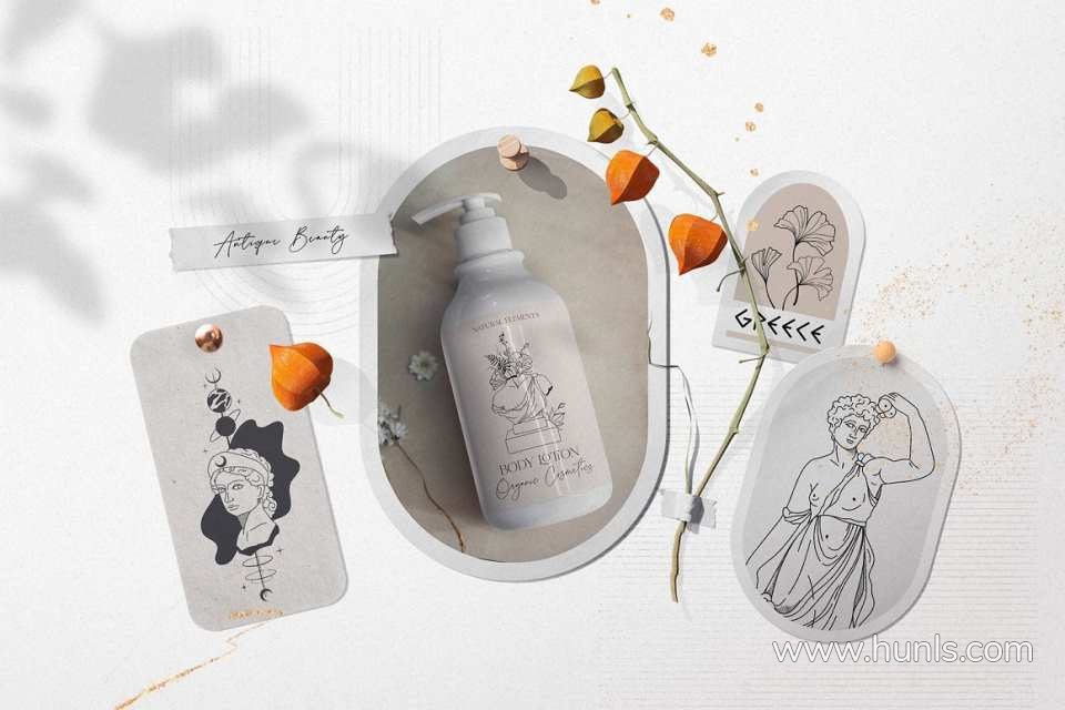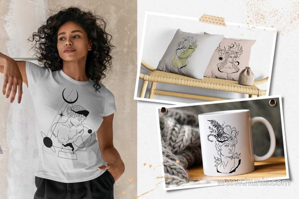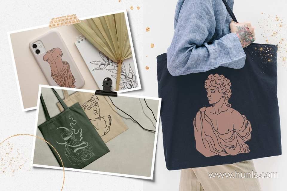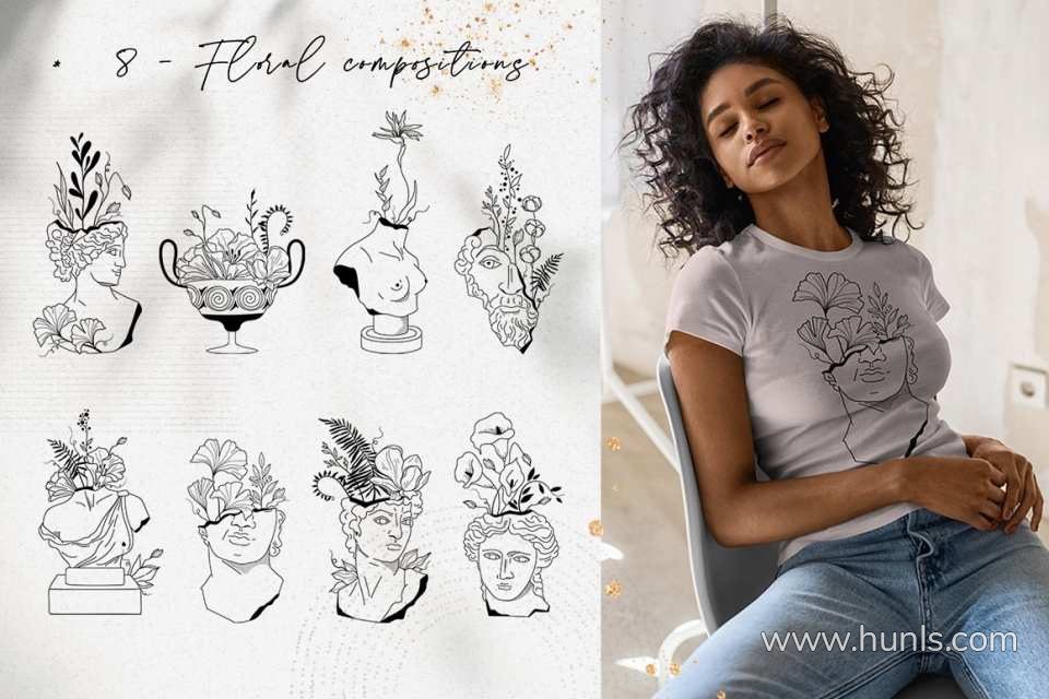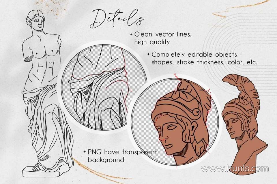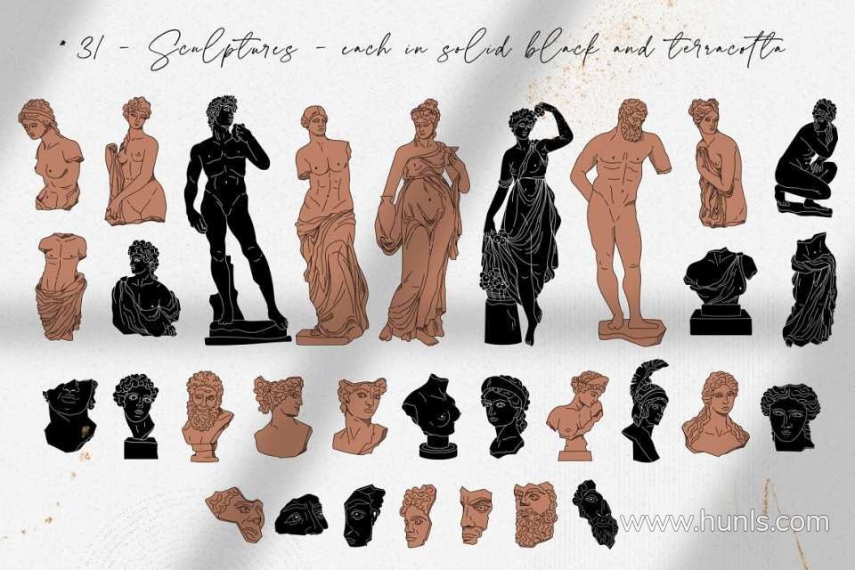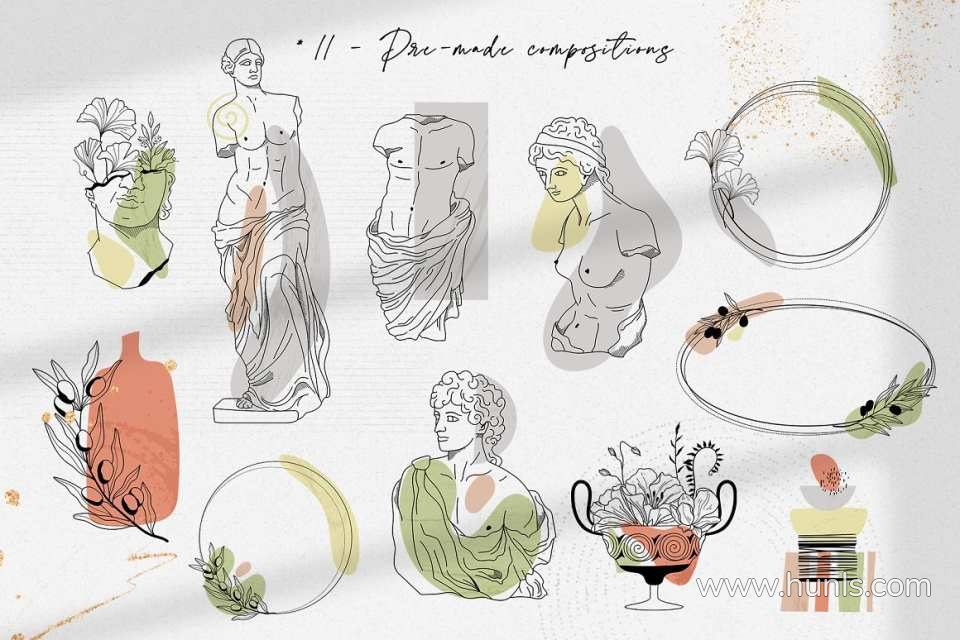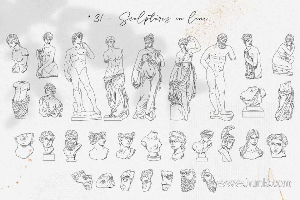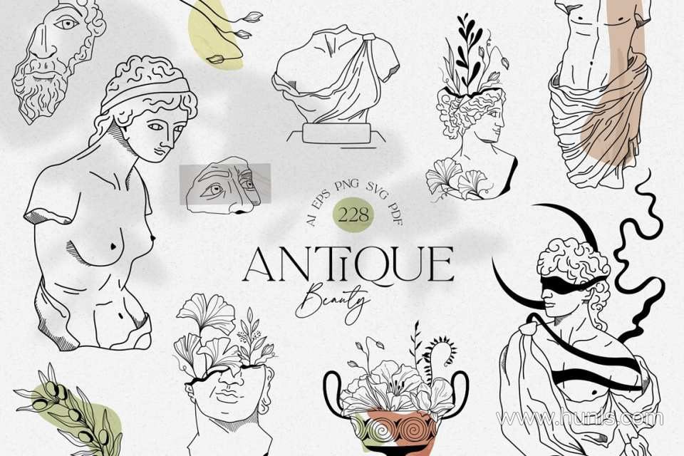 228张古希腊神话英雄人物雕像装饰饰极简艺术手绘线描插画AI矢量设计素材 Antique greek beauty – designs kit
