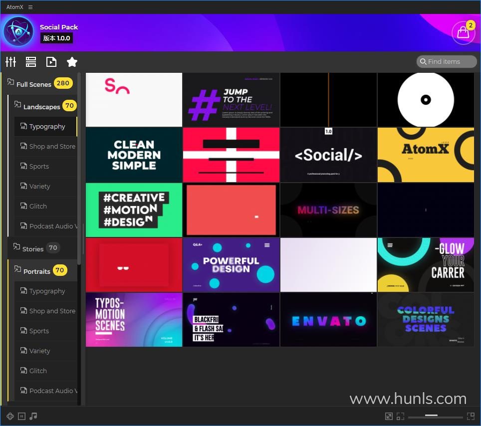 在社交媒体上成功推广您的业务的完美方式,这就是我们创建Social Pack的原因 ,它是必须强大的精心设计的包,其中包含1125多个不同类别的动态设计元素。280个完整场景、537运动库、176 个运动元素、132 音效等。使用AtomX脚本调用预设,可视化预览,双击即可直接使用于时间线,使用非常简单。这将为您提供流畅的工作流程体验和功能:一键式工作流程、自动调整大小和实时预览。