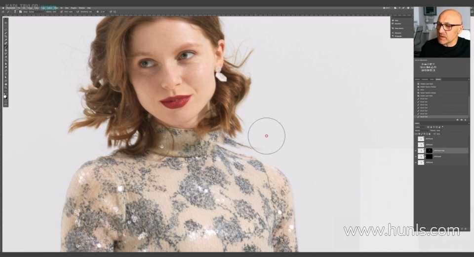 您还将看到 Karl 使用液化工具调整模特的头发、加深和减淡以增加图像的活力,并创建色相饱和度层以对曝光进行细微的改进。