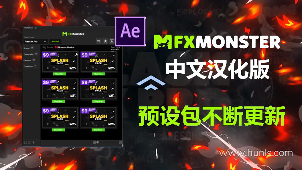 AE汉化脚本FXMonster自带4套完整版预设包 2DFX Generator/Flash FX Pro/Pretty Sweet/Premium Pack