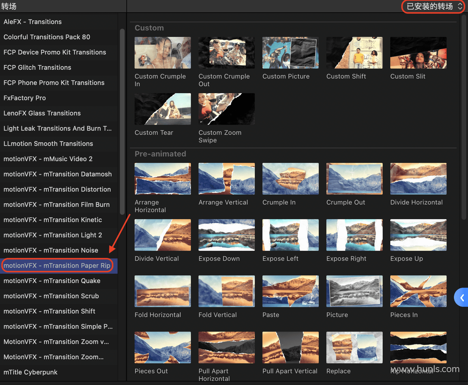 FCPX插件-52种复古嘻哈杂志撕纸折痕拼贴效果风格化转场动画FCPX插件下载 motionVFX – mTransition Paper Rip