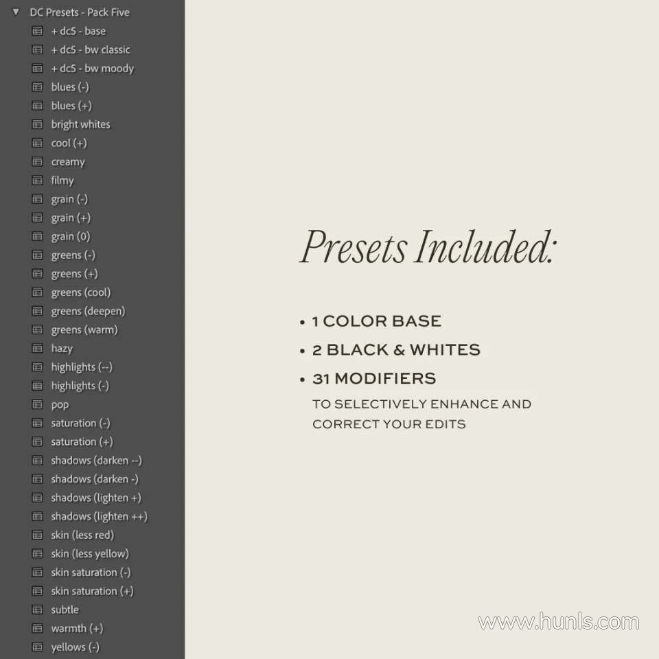 所有 DC 桌面预设包均包括 1 个基色预设、2 个黑白预设、31 个修饰预设,可选择性地增强和纠正您的编辑(例如“流行”、“微妙”、“胶片”、“朦胧”、“奶油色”、多种皮肤)校正器、绿色校正器等)、迷你编辑课程、针对每个包的“与我一起编辑”视频,以及包含下载和安装说明、编辑技巧等的 PDF 指南。这些预设与 Lightroom 和 Adobe Camera Raw 兼容。
