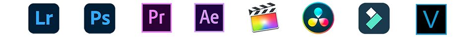 Lightroom, Photoshop. Premiere Pro, Adobe After Effects, Final Cut Pro, DaVinci Resolve, Filmora, Vegas Pro. LumaFusion.Luminar, PowerDirector