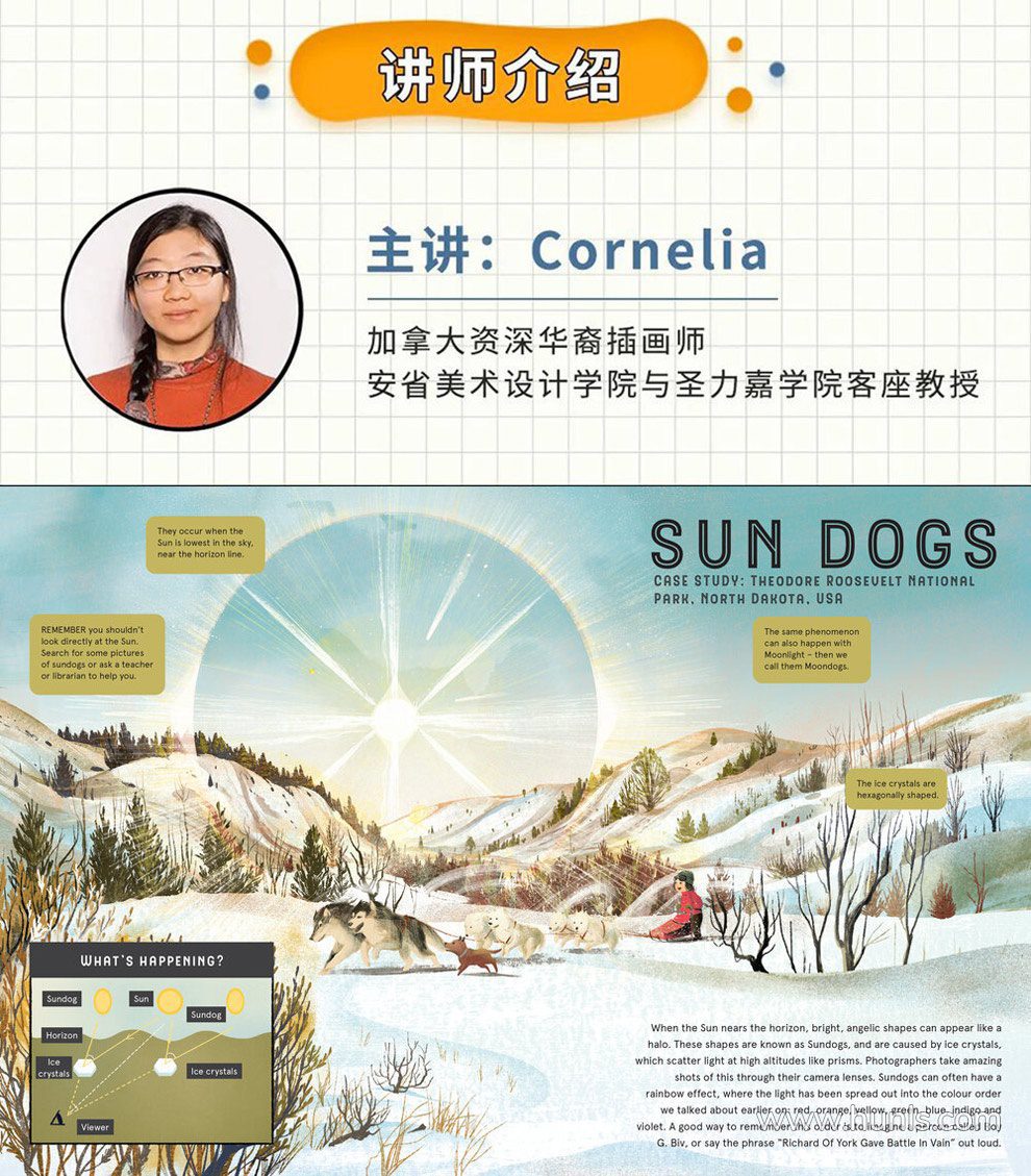 目前,市面上关于童书、绘本创作的课程非常多,但能把全年龄段出版物插画讲明白的老师寥寥无几。 Cornelia老师是其中一个,她可以说是出版刊物类插画天花板级别的插画艺术家。Cornelia老师是加拿大资深华裔插画师,拥有非常全面的创作能力,作品涉及报刊插画、儿童读物、动画分镜、广告设计等多种领域,在国际插画艺术圈有着较大的影响力。