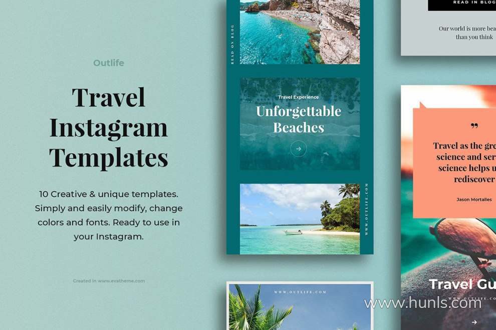 “Travel”类别中的 10 个时尚且独特的模板。这对于喜欢分享旅行印象并将其展示给其他人的旅行博主来说非常有用。简单轻松地修改、更改颜色和字体。可以在您的 Instagram 中使用。这些模板是完全可定制的并且与 Adobe Photoshop 兼容。
