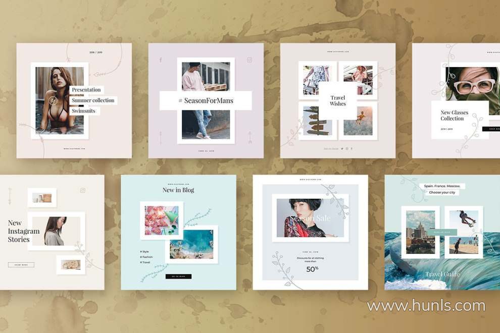 10 个简洁的 Instagram 模板。这是一套适合流行博主、流行明星或各种时尚品牌的时尚横幅。该系列将轻松帮助您宣传您的想法、产品和各种促销活动。轻松时尚地与用户分享您的印象。这些模板非常适合不同的类别,例如:时尚、旅行、美食、个人博客、视频博客、Instagram 中的故事等。