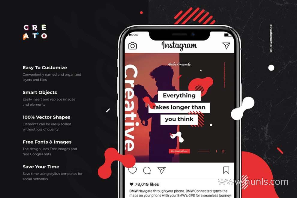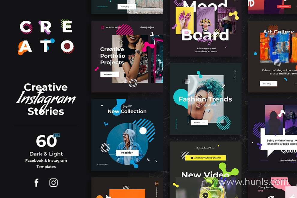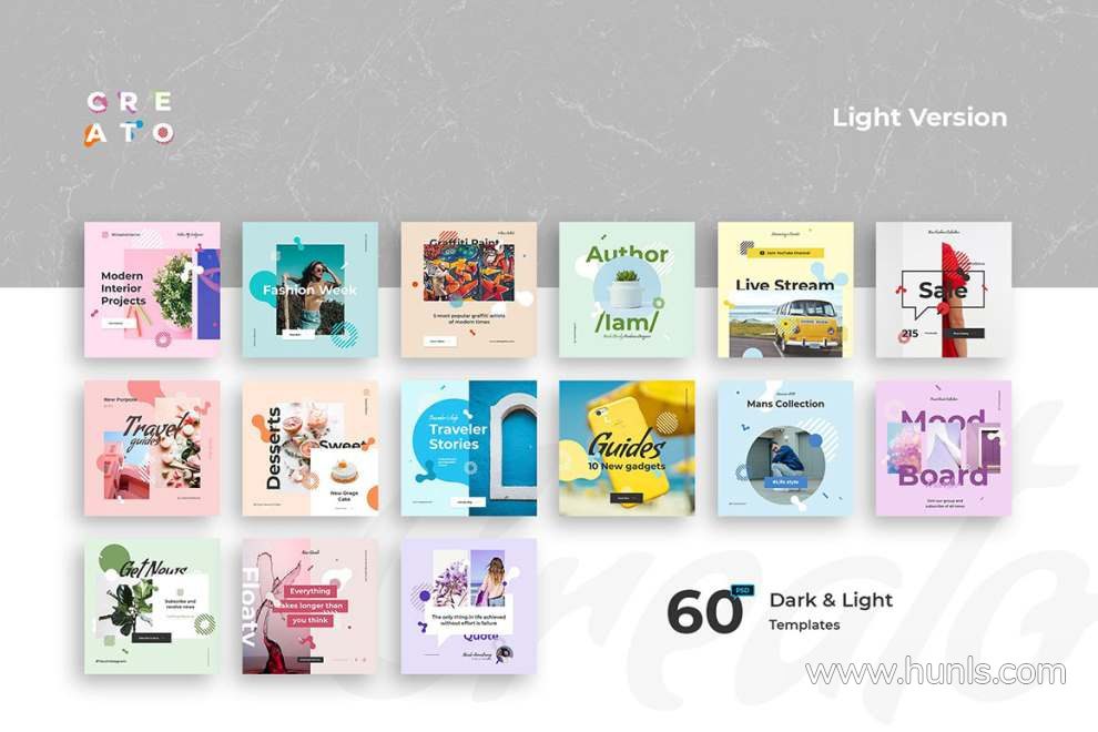 Creato – 这是一个时尚、时尚、创意、现代的模板包,适用于广告公司、创意笔记、流行博主和时装设计师。使用在深色版本和浅色版本中执行的60 个优质 Instagram 和 Facebook PSD模板。这些模板的罗马化具有无限的可能性,您可以在其中创建新模板或更改当前模板。该产品具有多种用途,但更适合广告:服装品牌、促销、珠宝和香水品牌、食品、个人设计项目和博主。