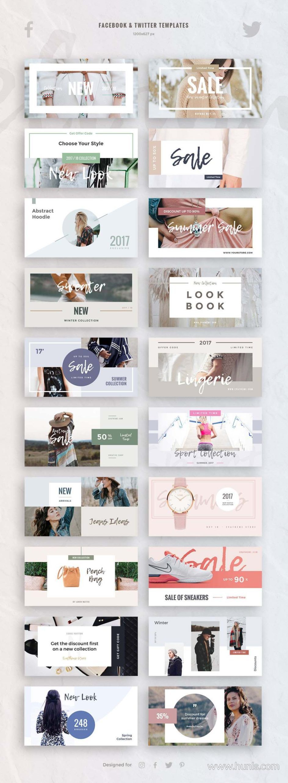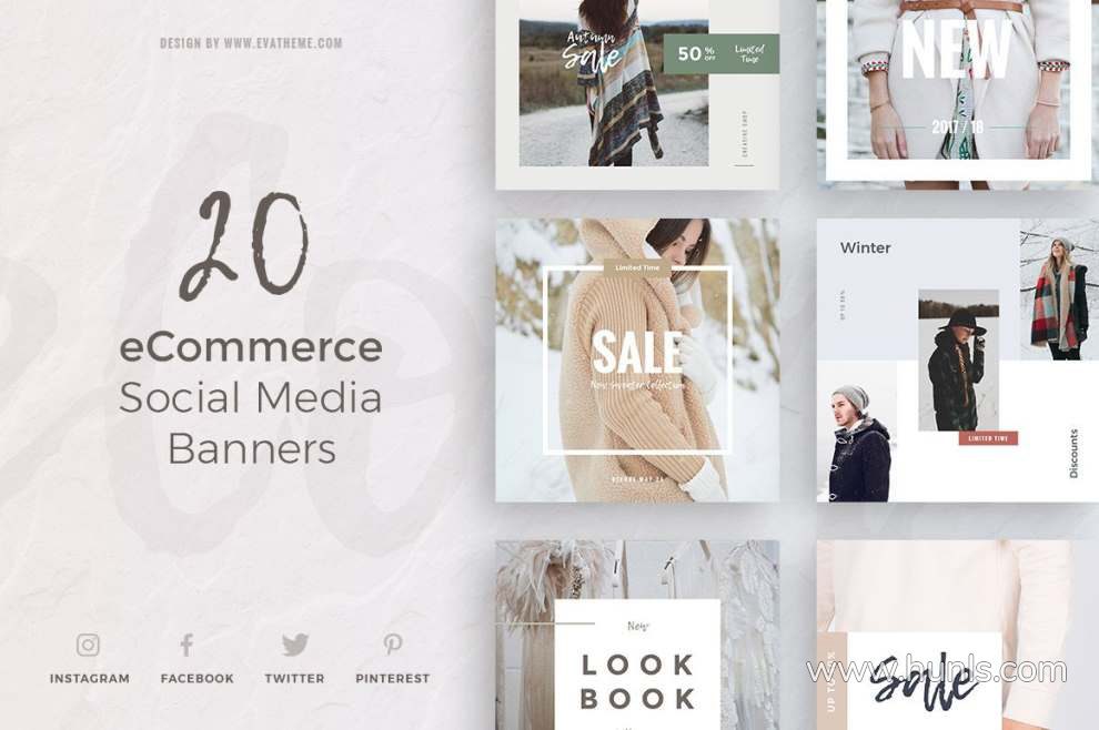 令人惊叹的电子商务 – 社交媒体工具包。适用于流行社交网络(Twitter、Facebook、Instagram、Pinterest)的时尚而独特的20 个电子商务促销模板。用于在各种在线商店中做广告,以宣传他们的产品和商品。