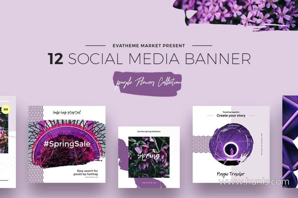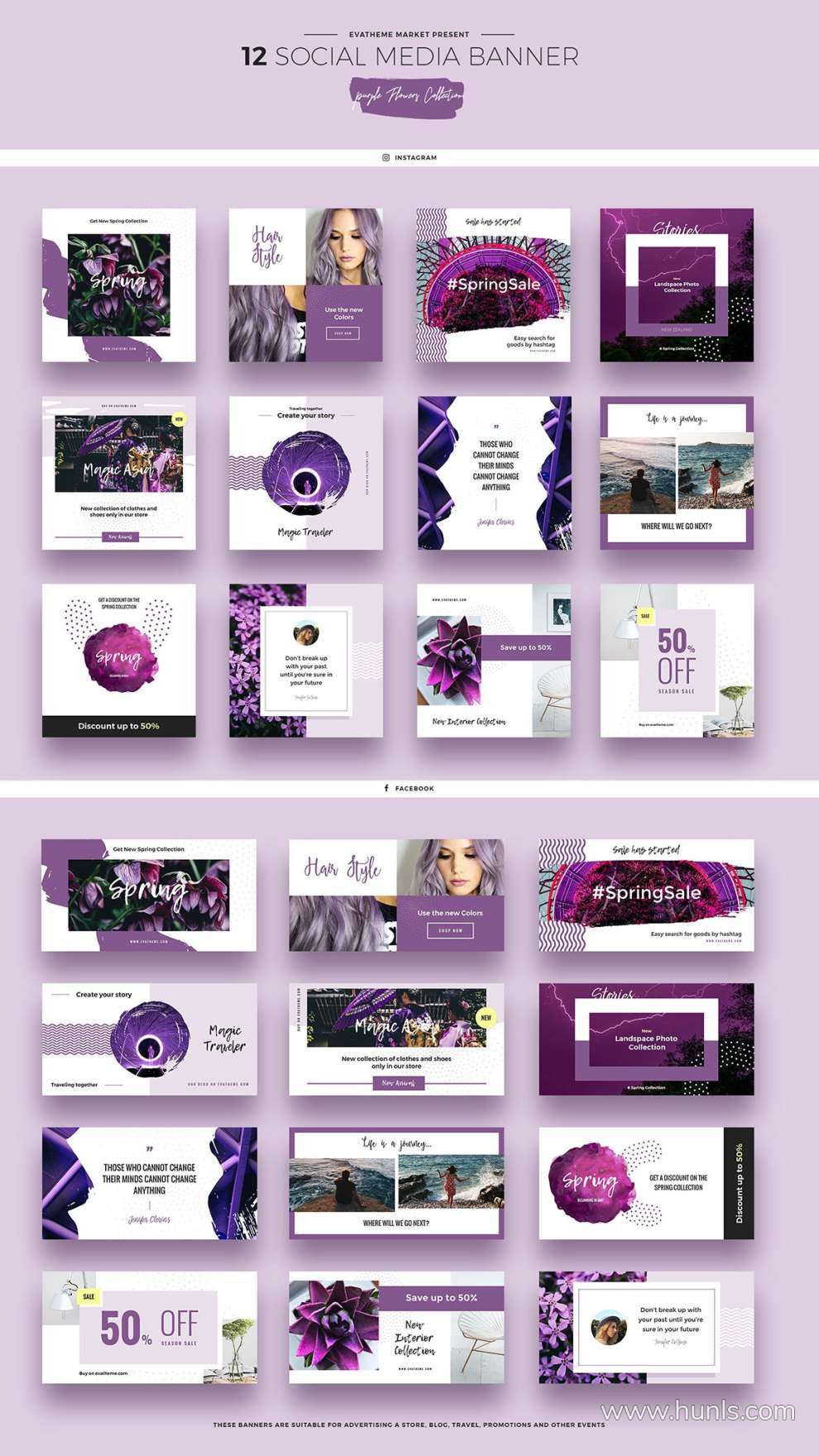 紫色花朵系列 – 12 种社交媒体设计!时尚美丽的36 个促销横幅,适用于流行的社交网络,采用紫色制成。它们可以用于不同的方向,例如:生活方式、时尚、美食、旅行、博客、营销或趋势博主、创意工作室、社交网络广告活动或在线营销、产品广告。