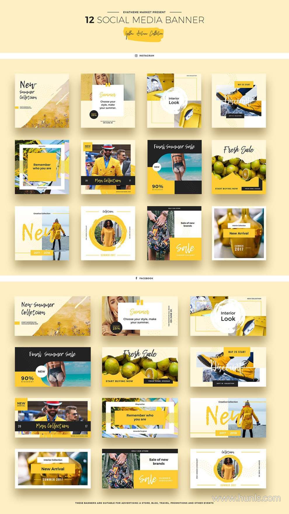黄色秋季系列 – 12 款社交媒体设计!时尚美丽的36 个促销横幅,适用于流行的社交网络,采用黄色制作。它们可以用于不同的方向,例如:生活方式、时尚、美食、旅行、博客、营销或趋势博主、创意工作室、社交网络广告活动或在线营销、产品广告。
