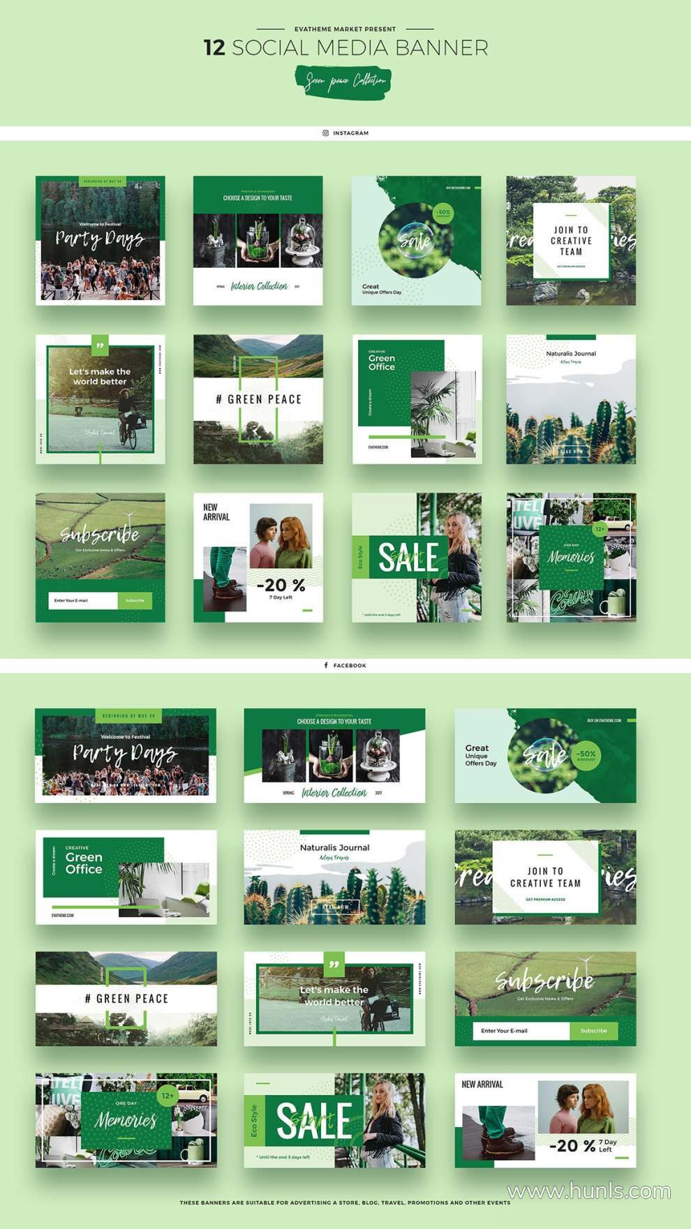绿色和平系列 – 12 个社交媒体设计!时尚美丽的36 个促销横幅,适用于流行的社交网络,采用绿色。它们可以用于不同的方向,例如:生活方式、时尚、美食、旅行、博客、营销或趋势博主、创意工作室、社交网络广告活动或在线营销、产品广告。
