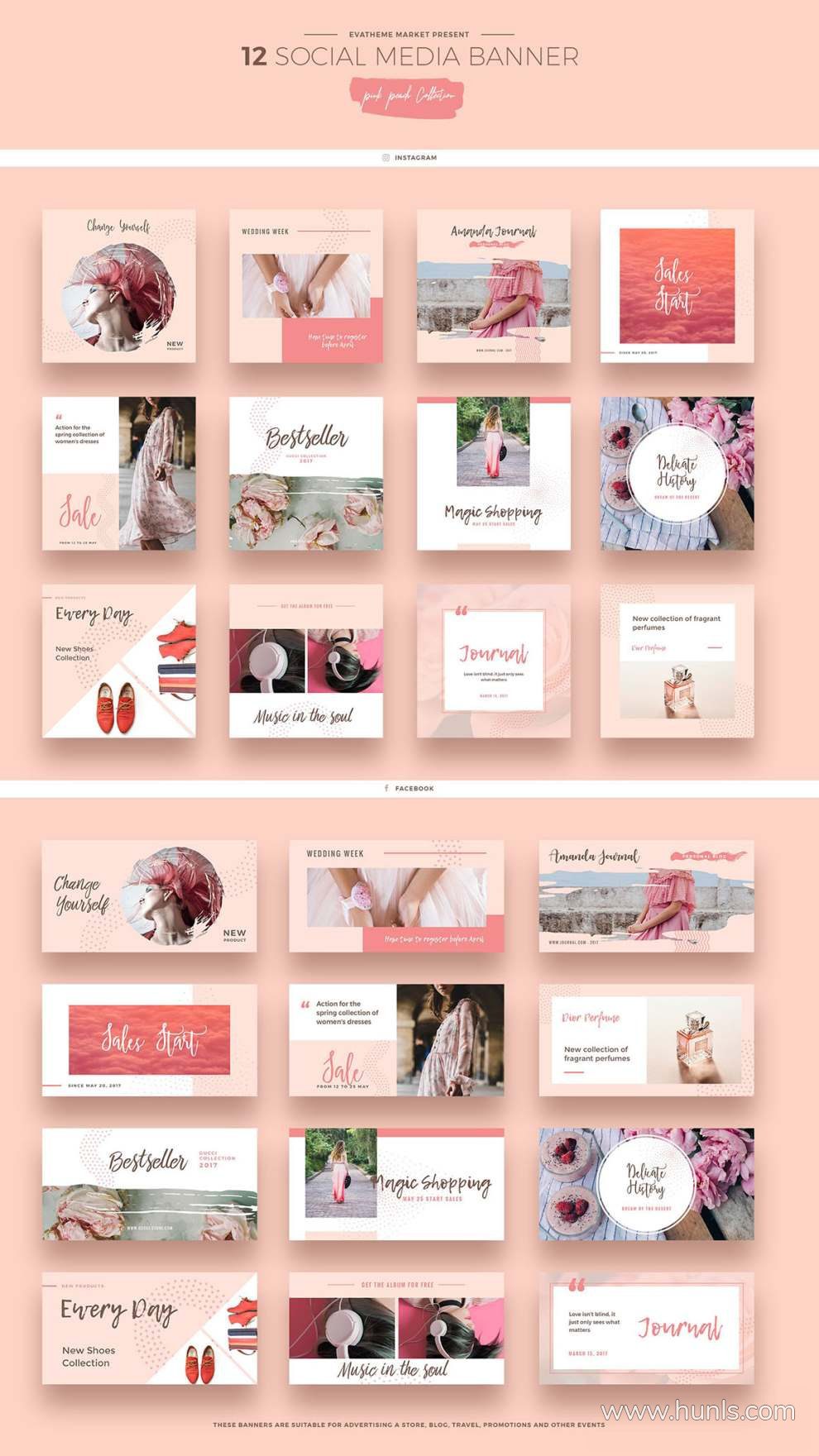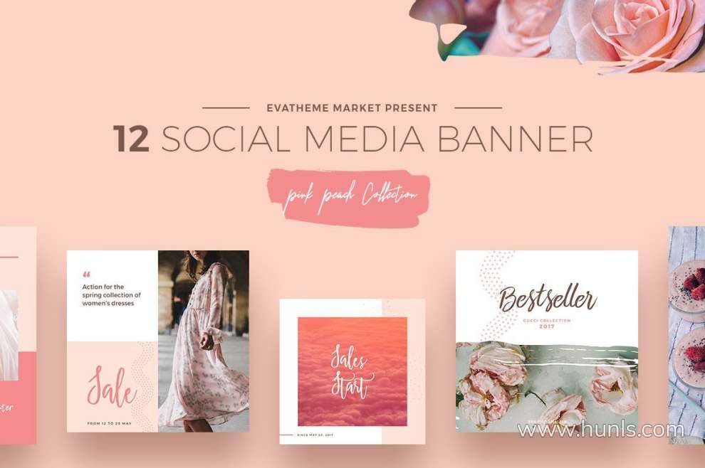 粉红桃子系列 – 12 种社交媒体设计!时尚美丽的24 个促销横幅,适用于流行的社交网络,采用粉色和桃色制成。它们可以用于不同的方向,例如:生活方式、时尚、美食、旅行、博客、营销或趋势博主、创意工作室、社交网络广告活动或在线营销、产品广告。