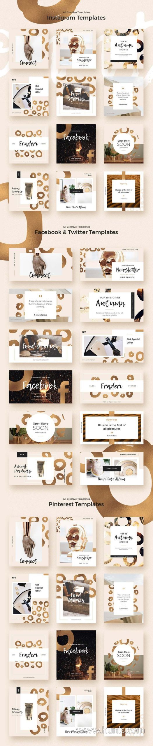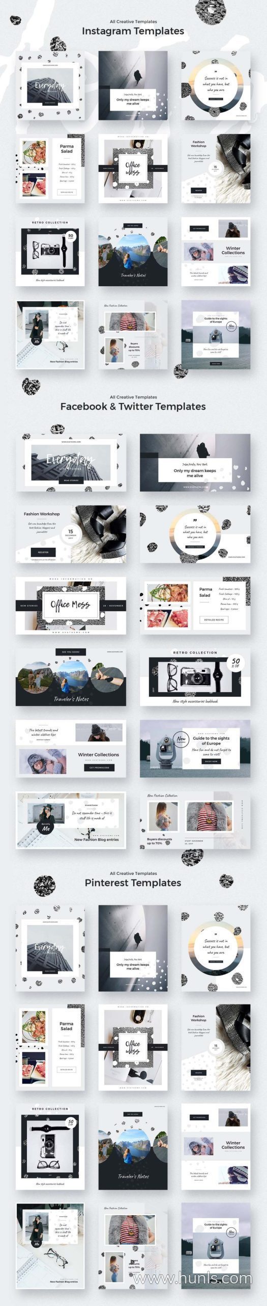 Evatheme Market的这个捆绑包包含为Instagram、Twitter、Facebook、Pinterest和Dribbble 设计的极其丰富的模板集合,涵盖了博主、时尚品牌、设计师和杂志的需求。借助智能对象,您在其中找到的所有产品都可以轻松编辑和自定义,因此即使您没有设计师背景,只需单击几下即可处理它们。您一定会惊讶地发现它是如此简单和快速。通过这笔交易,您可以获得:778 个超级创意 Photoshop 模板,适合您的社交媒体促销活动!以专业风格在几分钟内创建您的促销活动!文件大小:8.2G