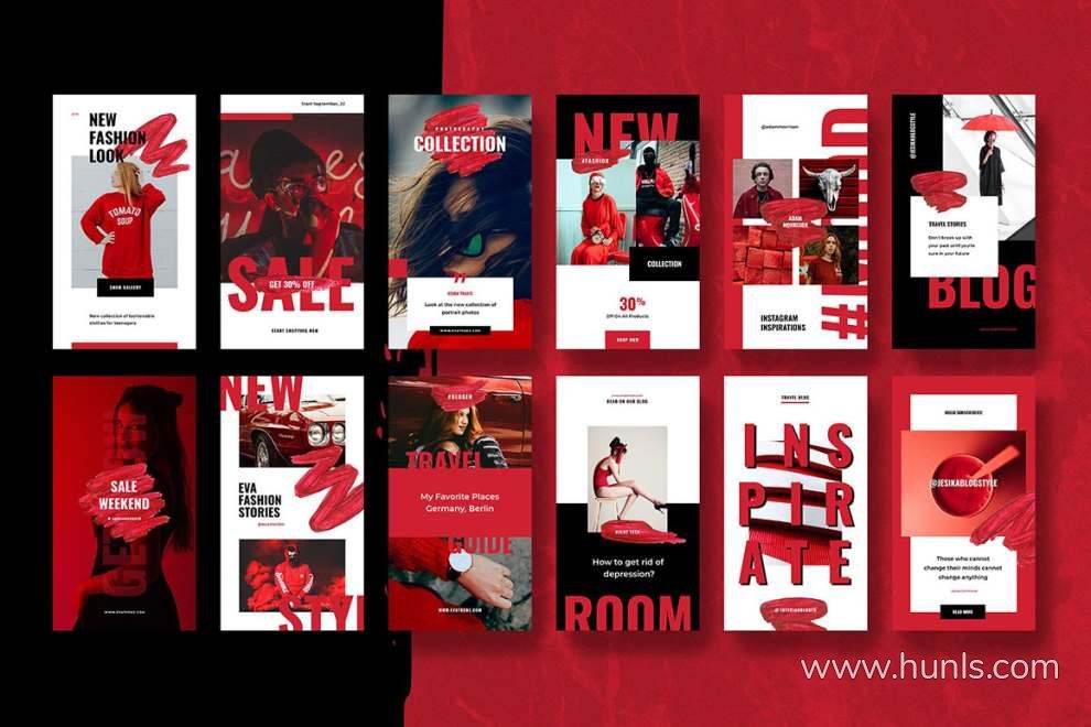 动画 Blackred Instagram 故事合集。借助这些时尚的横幅,您可以轻松创建时尚且有吸引力的广告,呼吁采取行动并展示您的品牌品味。时尚的横幅将帮助您从众多单调的模板中脱颖而出,并强调您的品牌、公司等的风格。该套装包含12 个动画模板和 12 个静态模板。它们完全可以使用,您只需替换文本和图片,选择所需的品牌颜色,替换字体(如果您愿意)并将它们上传到您的社交网络(instagram、facebook、twitter 等)