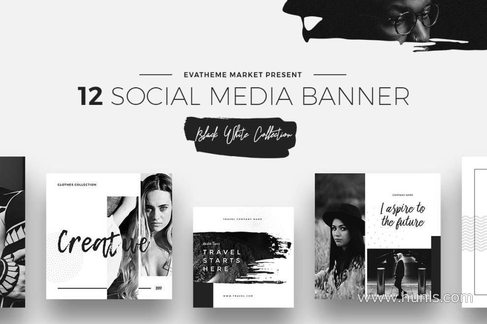 黑白系列 – 12 种社交媒体设计:时尚美丽的24 个促销横幅,适用于流行的社交网络,采用黑白颜色制作。它们可以用于不同的方向,例如:生活方式、时尚、美食、旅行、博客、营销或趋势博主、创意工作室、社交网络广告活动或在线营销、产品广告。