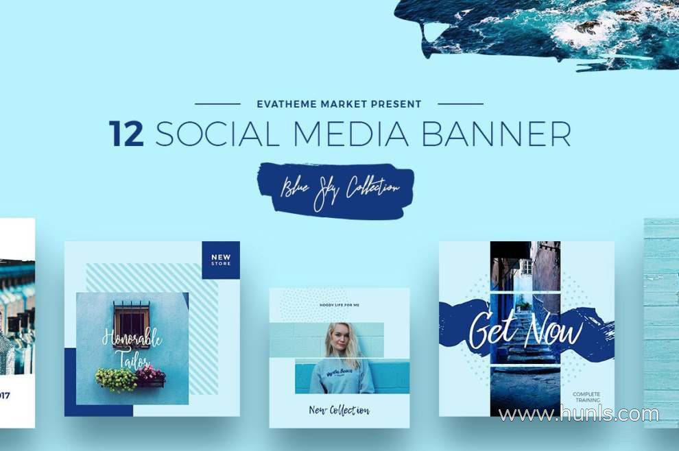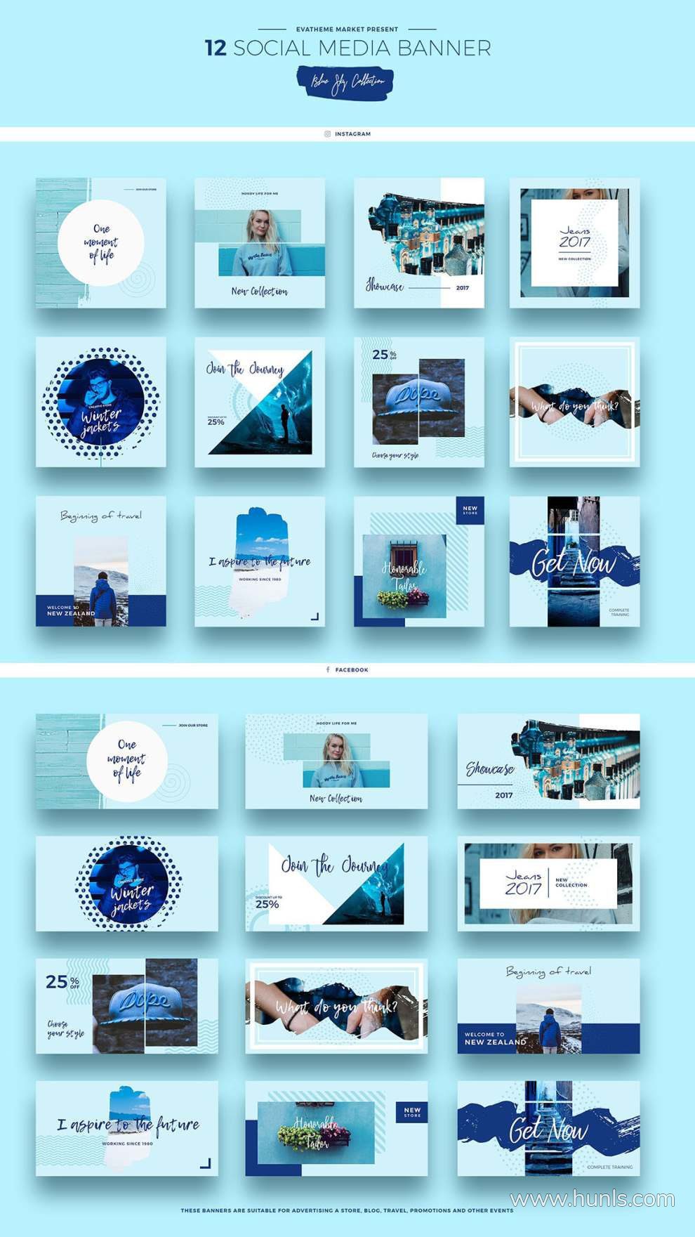 蓝天系列 – 12 款社交媒体设计!时尚美丽的24 个促销横幅,适用于流行的社交网络,采用蓝色制作。它们可以用于不同的方向,例如:生活方式、时尚、美食、旅行、博客、营销或趋势博主、创意工作室、社交网络广告活动或在线营销、产品广告。