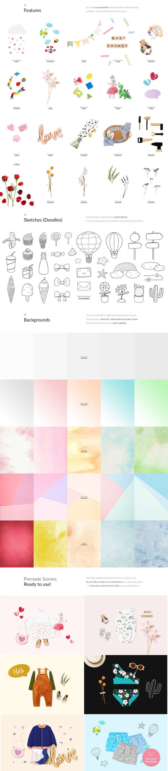 • + 预制场景即可使用! 借助“Baby Lookbook Creator Bundle”,您可以通过 2 种方式进行工作。您可以编辑我们现成的合成(下面的预制场景)…或使用提供的元素从头开始创建自己的场景。