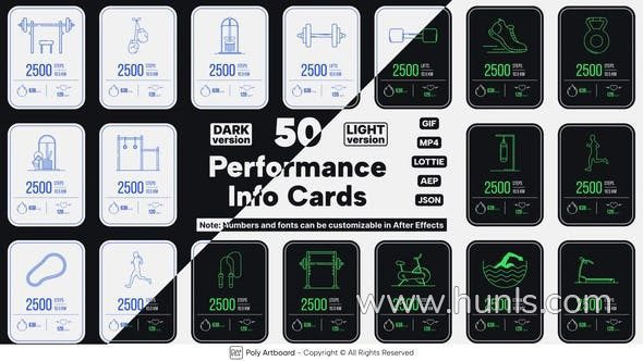 50张基于矢量的动画健身表现运动数据Lottie信息卡AE模版 Fitness Performance Lottie Info Cards